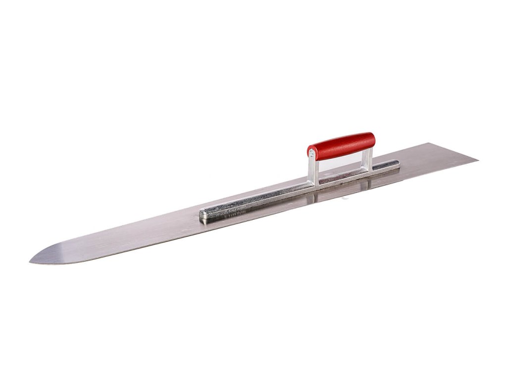 Schweizer Aufziehkelle, rostfrei, mit gerader Blattkante und deutschem Buchenholzgriff – Maße: 480 × 130 mm. Ideal zum gleichmäßigen Aufziehen von Putz.