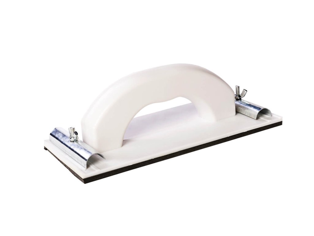 Dieser Handschleifer mit Bügelgriff ist ein einfaches, aber effektives Werkzeug zum Bearbeiten von Lack- und Farboberflächen. Die großzügige Schleif-Grundfläche von 228 × 110 mm ermöglicht gleichmäßige Schleifbewegungen über größere Flächen. Die Moosgummiauflage sorgt dabei für guten Kontakt zur Oberfläche und gleicht kleine Unebenheiten aus. Der Wechsel des Schleifpapiers erfolgt schnell durch Schraubklemmen. Das Kunststoffgehäuse hält das Werkzeug leicht und flexibel. Ein ideales Hilfsmittel für kleinere Abschleif- und Vorbereitungsarbeiten, besonders in der Renovierung oder im Feinbereich.