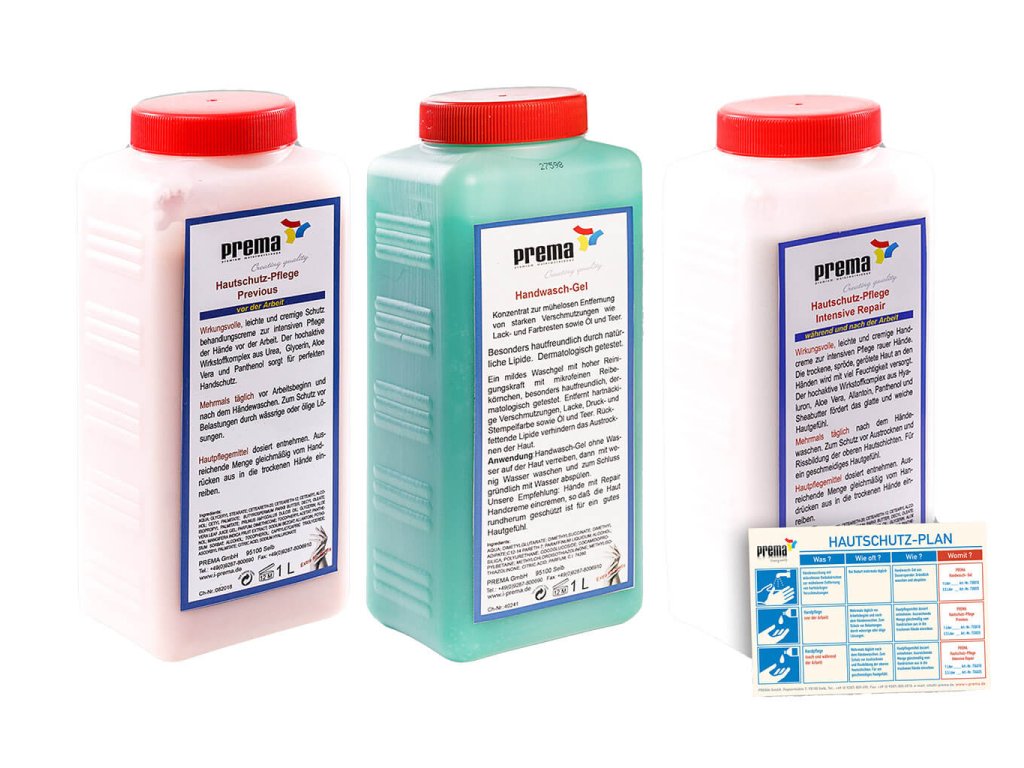 Das Hautpflege-Set von i-prema.de bietet eine umfassende Lösung für den Schutz und die Pflege der Haut im Arbeitsalltag. Es enthält ein Handreinigungsgel, das mühelos Lacke, Öle und Teer entfernt, ohne die Haut zu reizen. Die Hautschutzcreme "Previous" wird vor der Arbeit aufgetragen und schützt die Haut vor dem Eindringen von Verschmutzungen. Nach der Arbeit sorgt die "Intensive Repair"-Creme für eine intensive Pflege und Regeneration der Haut. Ein Hautschutzplan im DIN A3-Format unterstützt die korrekte Anwendung und ist in vielen Werkstätten von der Berufsgenossenschaft vorgeschrieben.