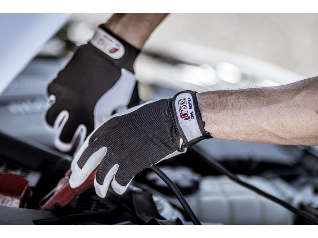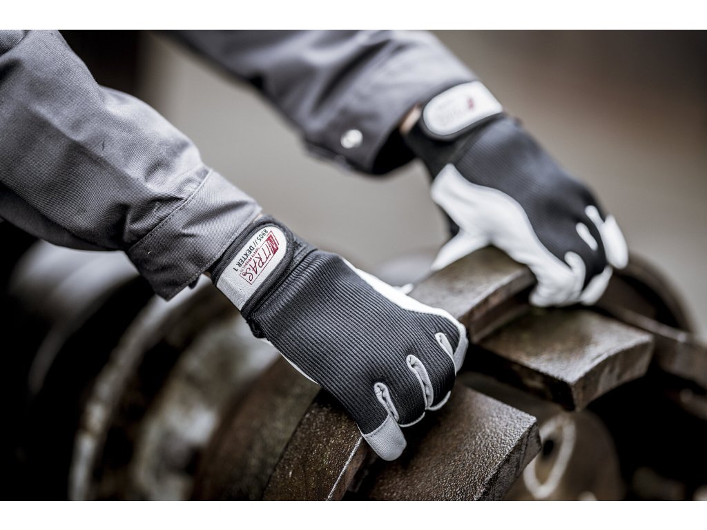 Der Nitras Dexter 1 Mechanikerhandschuh ist im i-prema-Sortiment als Premium-Lederhandschuh mit modernen Funktionseigenschaften positioniert. In der Handfläche kommt weiches Nappaleder zur Anwendung, das eine hohe Abriebfestigkeit mit angenehmer Haptik verbindet. Am Handrücken wurde ein leichtes, luftdurchlässiges Textilmaterial verarbeitet, das Schweißbildung reduziert und die Belüftung unterstützt. Der Handschuh ist ungefüttert, um das feinmotorische Arbeiten und ein gutes Tastgefühl nicht zu beeinträchtigen. Ein Klettverschluss am Handgelenk sorgt dafür, dass der Handschuh sicher sitzt und sich flexibel an unterschiedliche Handgelenksgrößen anpasst.