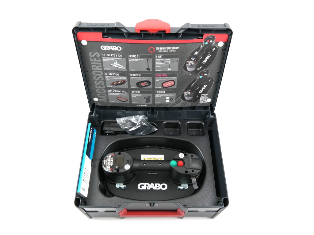 Je nach Material erreicht er eine Hebekraft bis ca. 160 kg, z. B. auf Glas, Fliesen oder Holz. Der Systainer-Koffer enthält den Grabo Pro, 1 Akku, ein Ladegerät, Ersatz-Schaumdichtung und Luftfilter – sofort einsatzbereit. Perfekt für Handwerker, die mobil schwere Platten transportieren.
