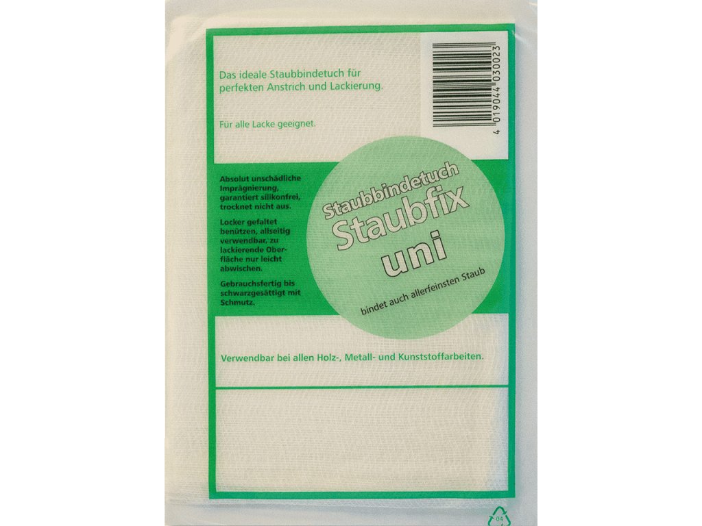 Das Staubbindetuch Staubfix® uni ist ein effizientes Hilfsmittel zur staubfreien Vorbereitung von Oberflächen vor Lack‑ oder Tapezierarbeiten. Im Vergleich zur Standard‑Ausführung ist es lockerer gewebt, was die Gleitfähigkeit erhöht. Die transparente Imprägnierung ist offenporig und ermöglicht so eine hervorragende Bindung feinster Staubpartikel. Das Set enthält 5 Tücher in klassischem Weiß, praktisch in der Verpackung lagerfähig und sofort einsatzbereit.