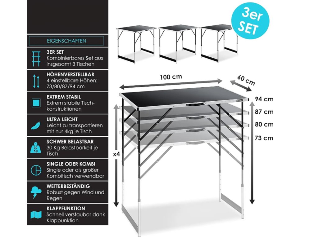 Der Aluminium‑Mehrzwecktisch (3 × 100 × 60 cm) überzeugt durch seine Mobilität und Stabilität. Die drei Einzelelemente erlauben flexible Aufstellung – einzeln oder verbunden. Dank der stufenlosen Höhenverstellung von 76 bis 94 cm passt sich der Tisch ideal Ihrer Körperhaltung oder Arbeitsabläufen an. Er ist aus wetterfestem Aluminium mit widerstandsfähiger MDF-Platte gefertigt, wiegt nur 10 kg, lässt sich leicht transportieren und schnell montieren. Die FSC®‑Zertifizierung (N001595) garantiert nachhaltige Materialien, und die kompakte Größe macht ihn vielseitig nutzbar – zum Tapezieren, als Picknick- oder Campingtisch.