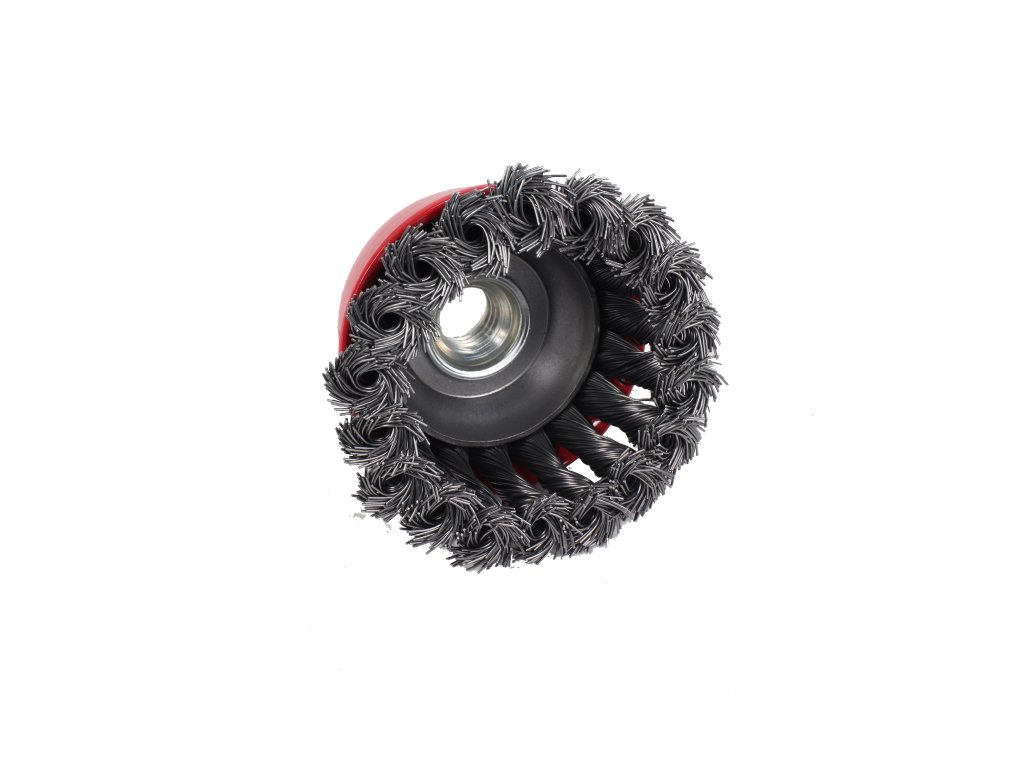 Die Topfburste M14 (Ø 65 mm, Artikelnummer 448006) von i-Prema ist eine robuste Drahtbürste für Winkelschleifer mit M14-Aufnahme. Der gezöpfte Stahldraht, ölgehärtet, gewährleistet hohe Widerstandskraft gegen Korrosion und Drahtbruch. Die Bürste eignet sich ideal zum Entfernen von Farbe, Rost, Schlacke und Graten auf Metall oder Mischoberflächen. Die Konstruktion erlaubt effizientes Arbeiten mit hoher Abtragsleistung. Der Einsatz auf Edelstahloberflächen sollte vorsichtig erfolgen, da aggressive Drahtbürsten feine Kratzer erzeugen können.